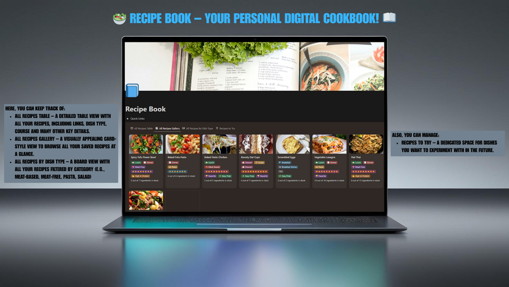 Tired of messy grocery lists, forgotten ingredients, or struggling to decide what to cook? The Kitchen Kit is here to simplify your kitchen life! This all-in-one Notion template helps you organize everything from recipes to meal planning and shopping lists, all in one place.